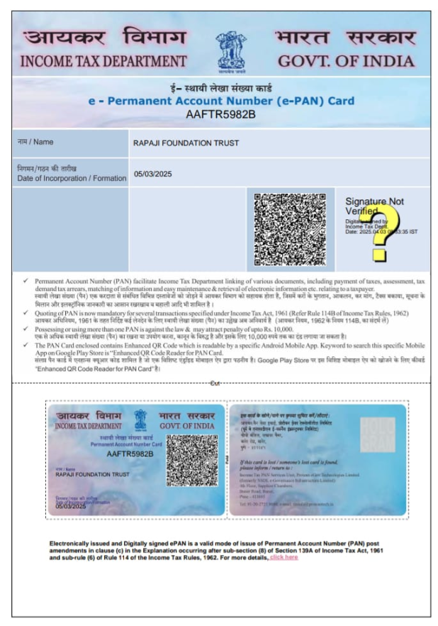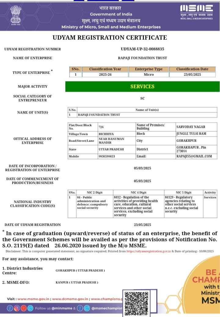 Rapaji Foundation Trust is a legally registered non-profit organization committed to transparency. All our legal documents and certifications are available for public verification.
